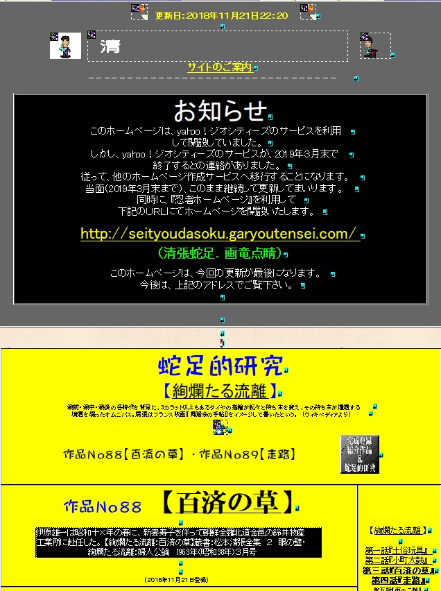 | 20/11/21 | シリーズ作品:死の枝(原作:十二の紐)より(第四話〜第七話) ※超豪華四本立て! ●蛇足的研究 作品No108 【史擬】 作品No109 【年下の男】 作品No110 【古本】 作品No111 【ペルシアの測天儀】 ●登場人物辞典 作品No105 【交通事故死者1名】 作品No106 【偽狂人の犯罪】 作品No107 【家紋】を登録 ●清張作品の題名に関する一考察(第三部/その十二) 【目と眼】 ●女性の名前【雪】(雪子・雪・雪代)の登録 |