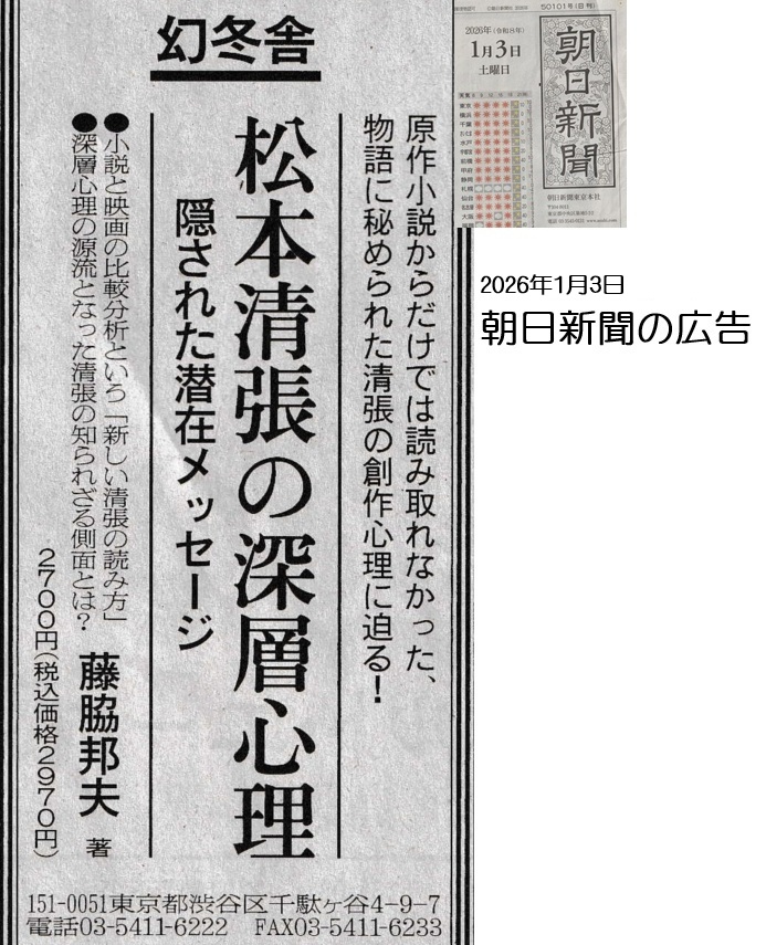 【MENU】 ●2026年1月3日● 朝日新聞記事&広告● 【松本清張の深層心理】 (隠された潜在メッセージ) (斉藤邦夫 著/幻冬舎) (2026年01月21日登録) |