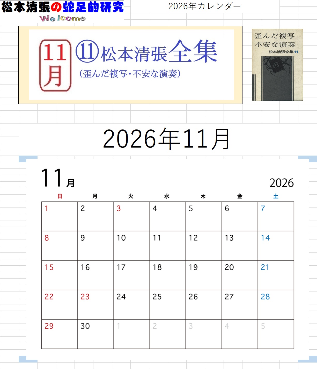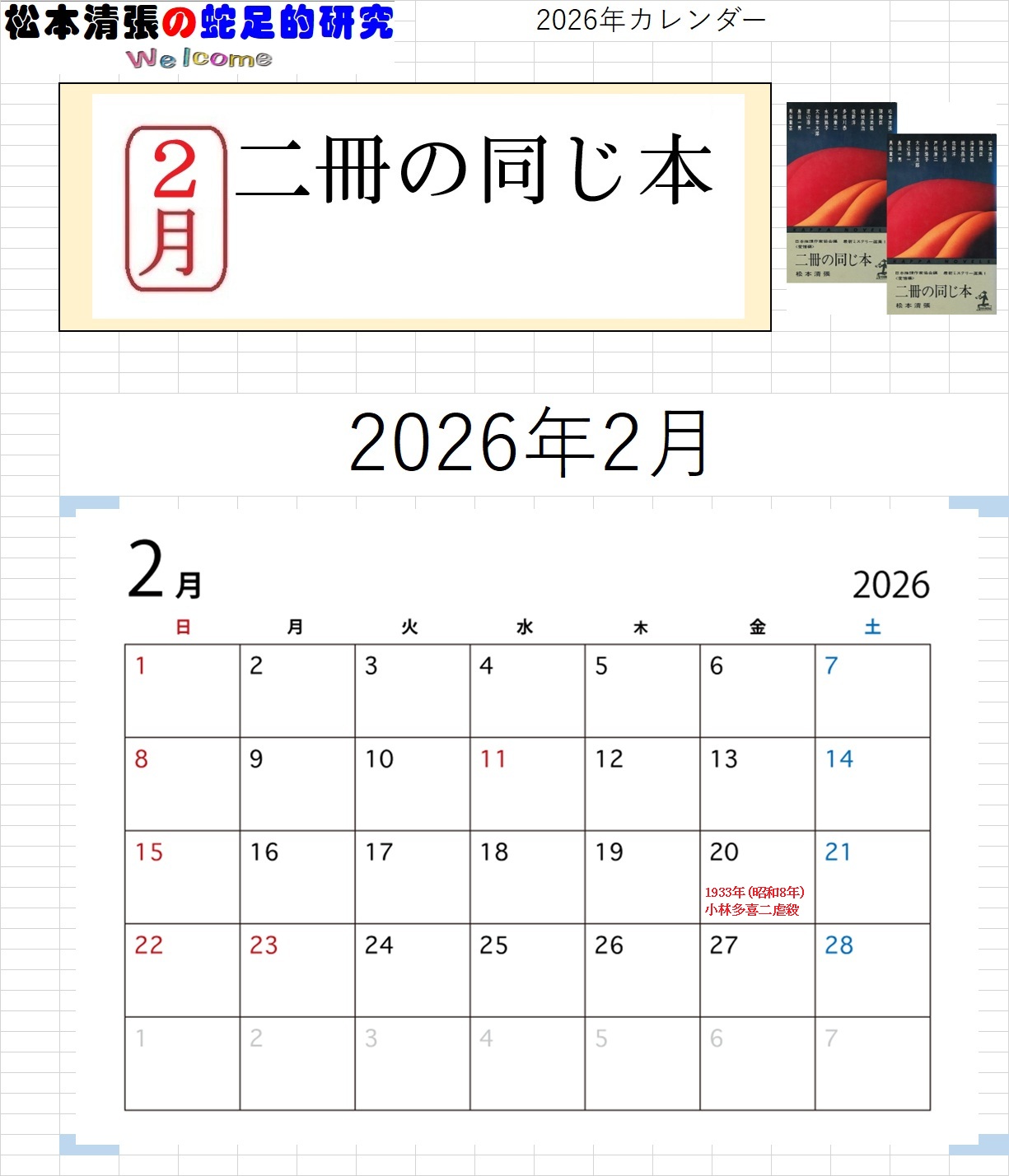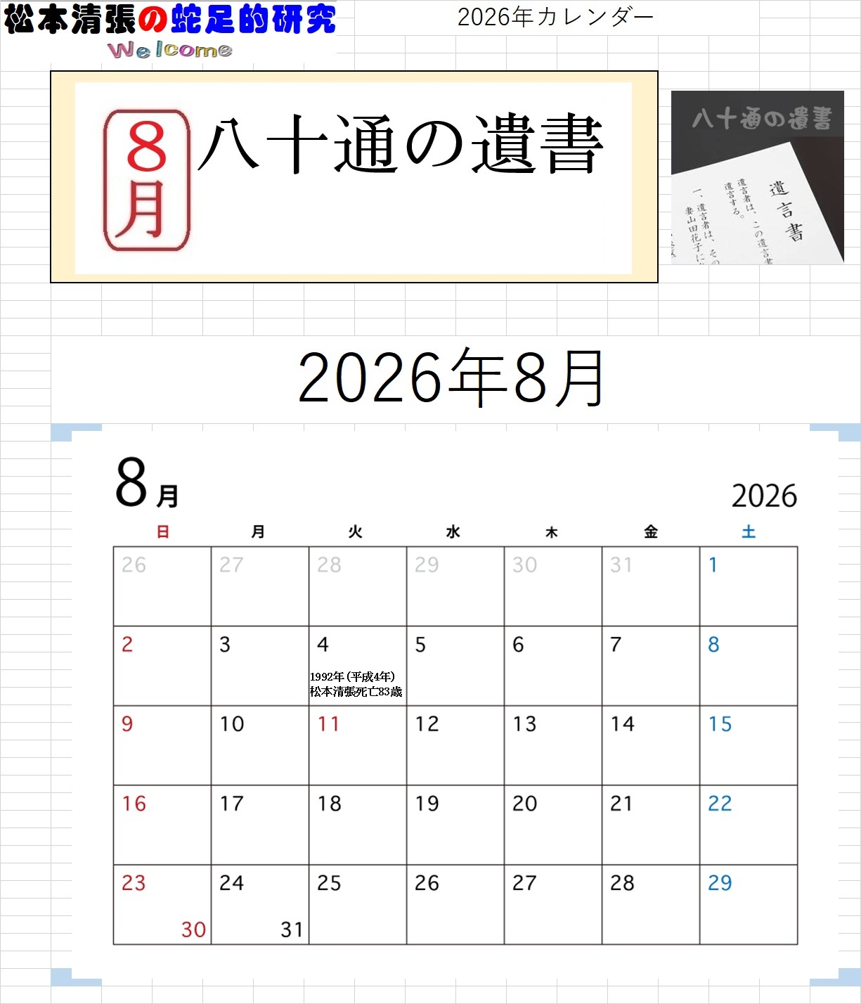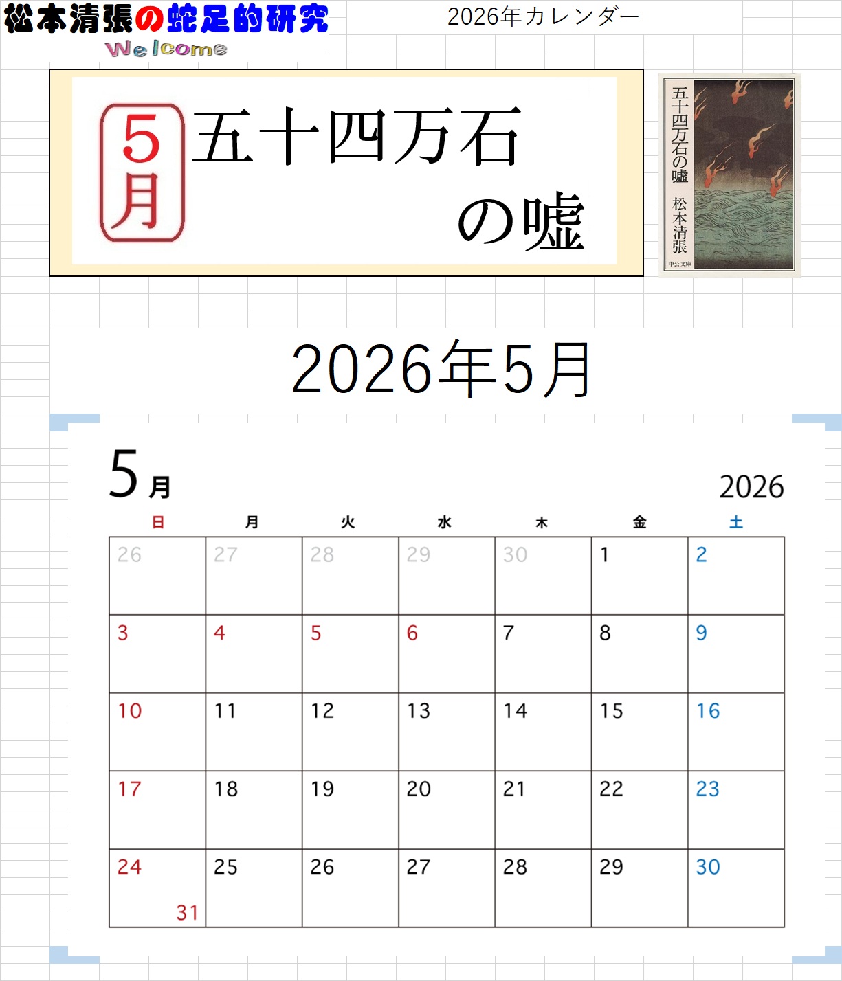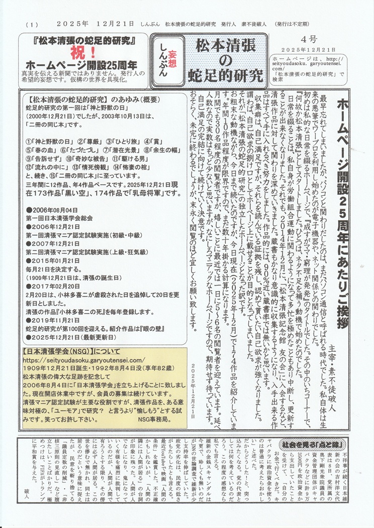 ![]() ホームページ 開設25周年記念 【特別企画】 このホームページのは、2000年12月31日に開設しました。 ここに25周年を迎えることが出来ました 25周年を記念して、カレンダーを企画しました。(第一弾) 【カレンダーのMENU】。 【清張作品(PDFファイルをダウンロード)カレンダー2026】 を、作製しました。(ダウンロード出来ます) ●月別カレンダー画像●