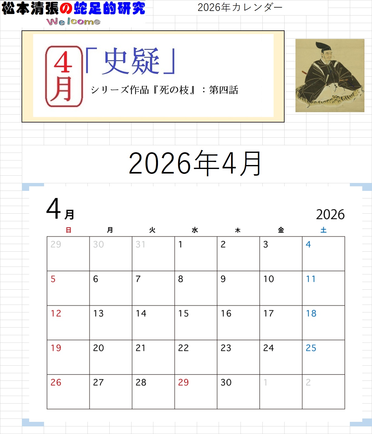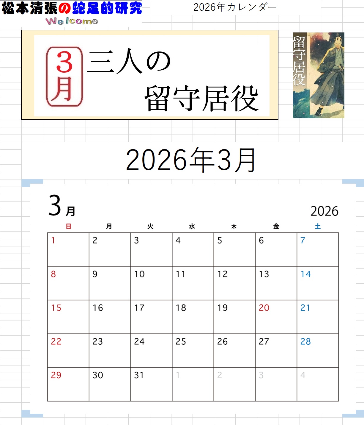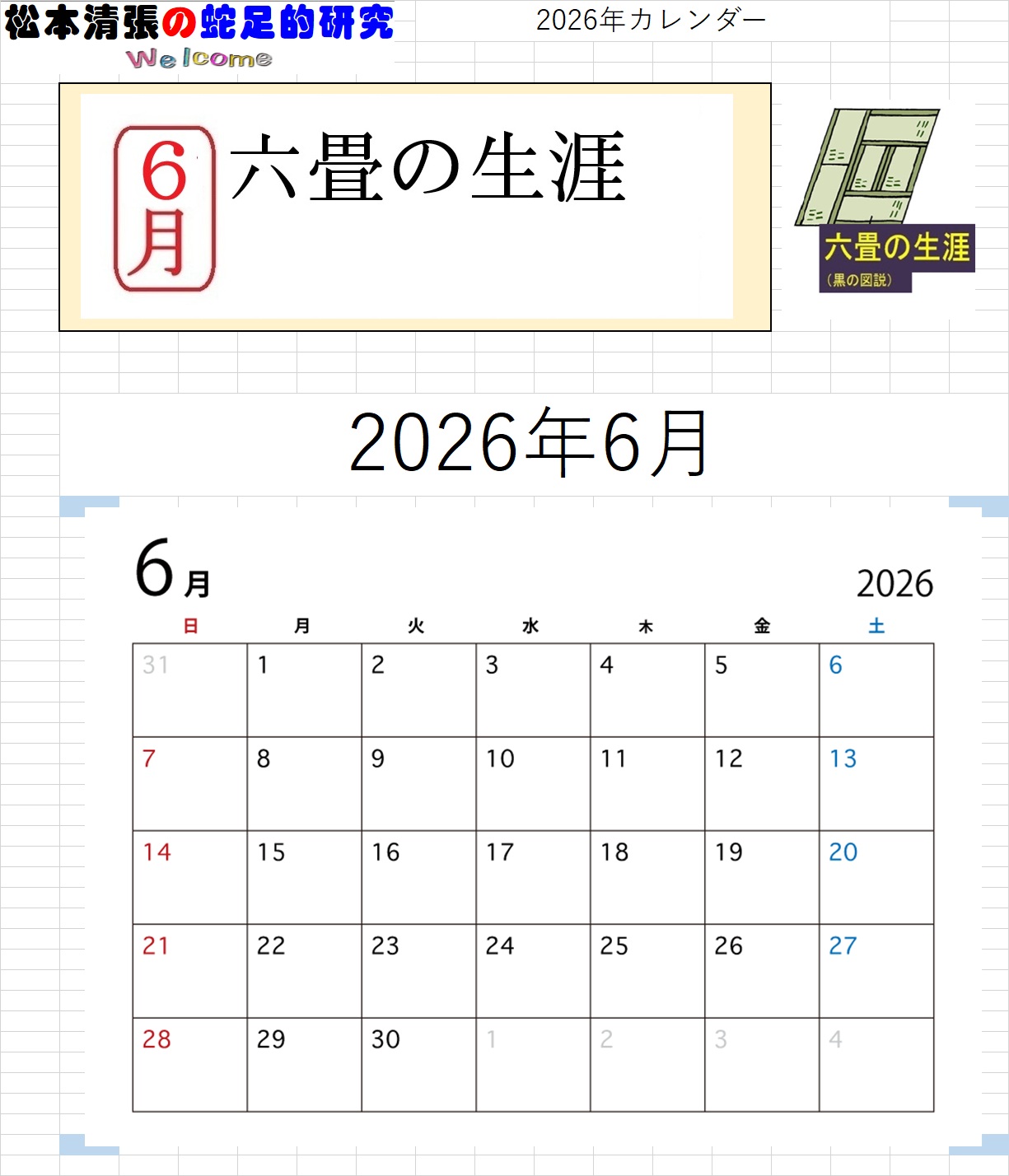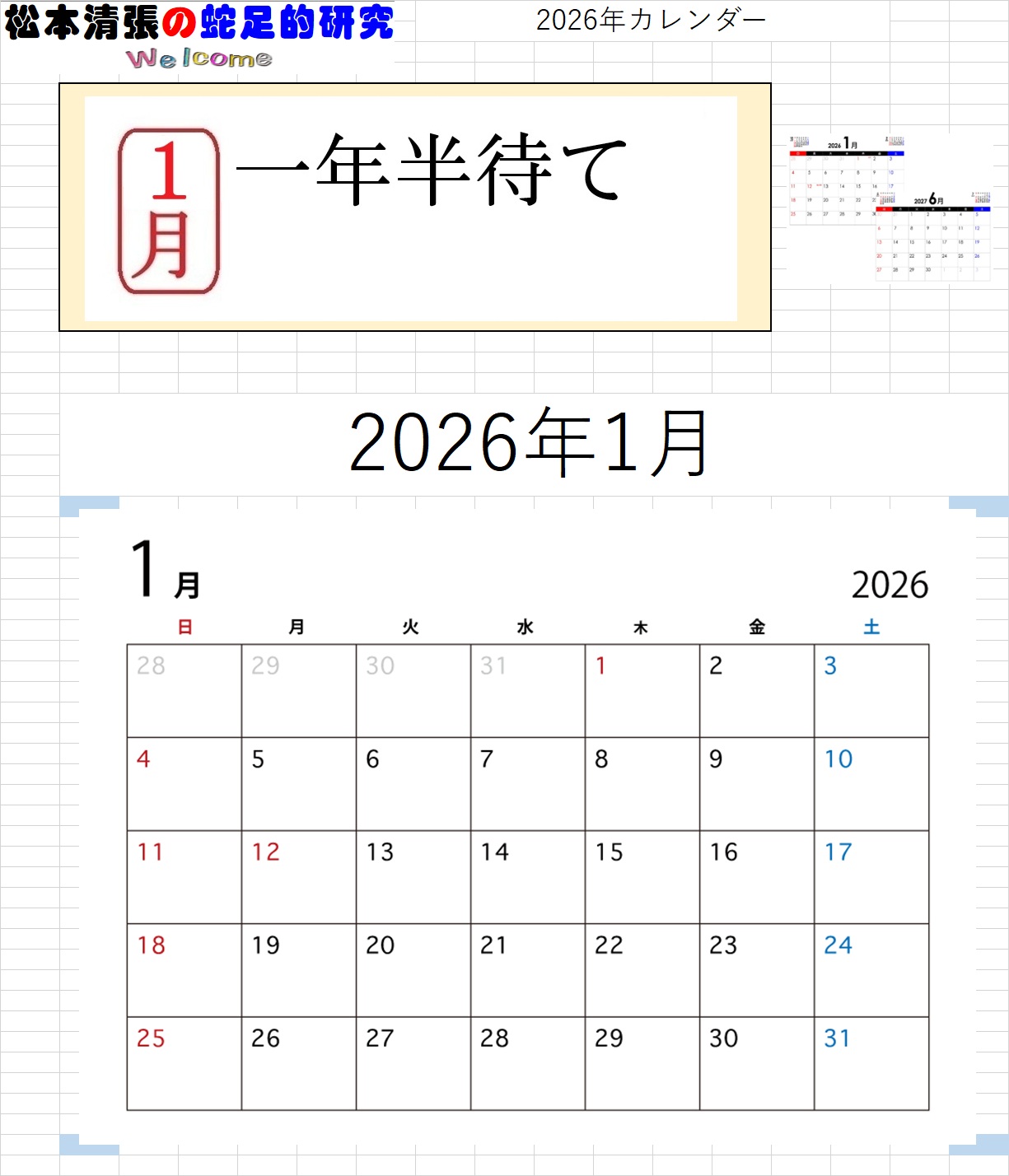 ![]() ホームページ 開設25周年記念 【特別企画】 このホームページのは、2000年12月31日に開設しました。 ここに25周年を迎えることが出来ました 25周年を記念して、カレンダーを企画しました。(第一弾) 【カレンダーのMENU】。 【清張作品(PDFファイルをダウンロード)カレンダー2026】 を、作製しました。(ダウンロード出来ます) ●月別カレンダー画像●